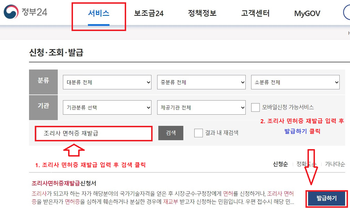 3. 입력창에 [조리사 면허증 재발급] 입력 후 검색